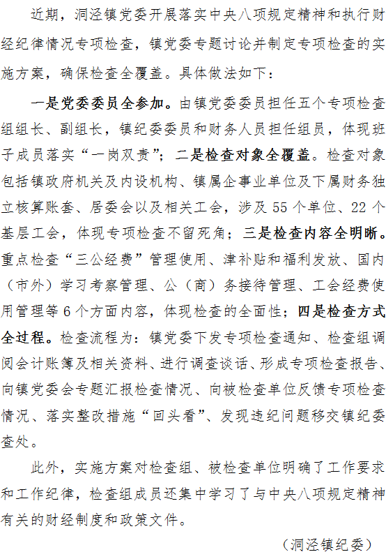 洞泾镇“地毯式”实施执行中央八项规定精神专项检查